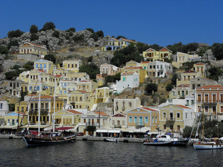 Gialos costituisce il cuore pulsante di Symi e rappresenta uno degli approdi più fotografati del Dodecaneso. Il porto naturale si inserisce in una profonda insenatura rocciosa, tanto che durante la Seconda Guerra Mondiale fu utilizzato come base per i sottomarini italiani. Le case neoclassiche dai colori pastello – dal giallo ocra al rosso veneziano, dal verde smeraldo al blu cobalto – si arrampicano sui versanti della collina creando un anfiteatro naturale di rara bellezza.